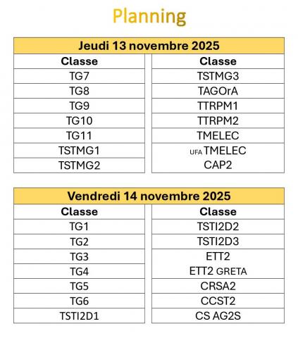 Nous avons le plaisir de vous informer que la remise des diplômes pour les sessions CAP, BAC, CS et BTS de 2025 se tiendra les 13 et 14 novembre prochains, à partir de 18h00, selon le planning ci-contre.
